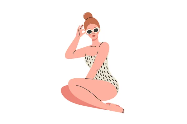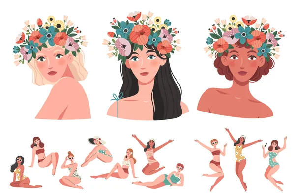 矢量美丽的夏日女孩穿着不同肤色和发型的泳装女性坐在各种姿势和泳装比基尼连体泳装度假概念
