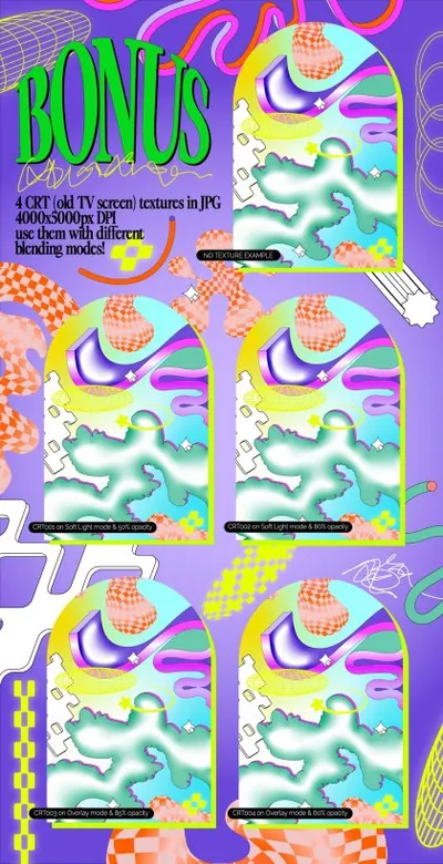 奖励:4 个 JPG 4000x5000 像素的 CRT 电视纹理(在“叠加”或“柔光”模式的软件中使用)