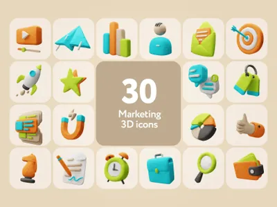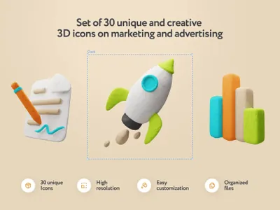 一套时尚的 30 个独特的 3D 营销图标。非常适合设计网站、应用程序或现代演示文稿。简单易用的调整将有助于根据您的风格和项目快速调整图标。
