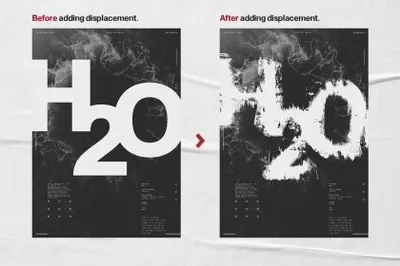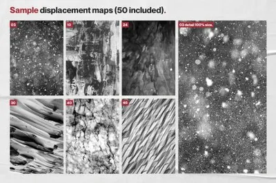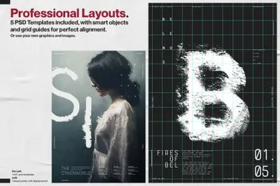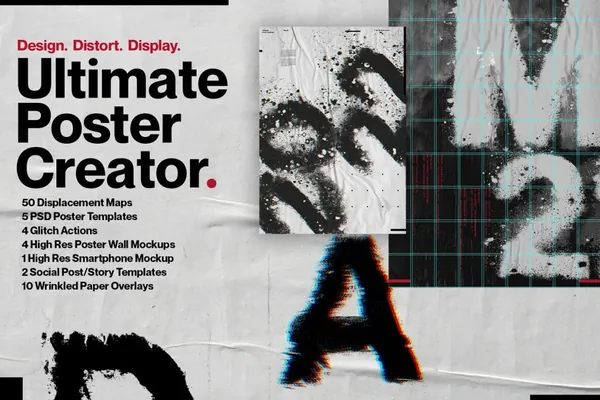 Ultimate Poster Creator 不仅包含50 张高分辨率置换贴图,可为您的设计增添令人难以置信的趣味性和动态感,而且还有5 个专业设计的 .Psd 海报模板。