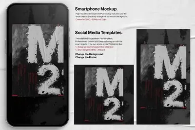 提供了 4 个海报模型,以及一个智能手机模型,以帮助您以最佳方式展示您的想法,以及两个社交媒体模板;帖子和故事,所有这些都使用智能对象,因此可以在几秒钟内更改艺术品。