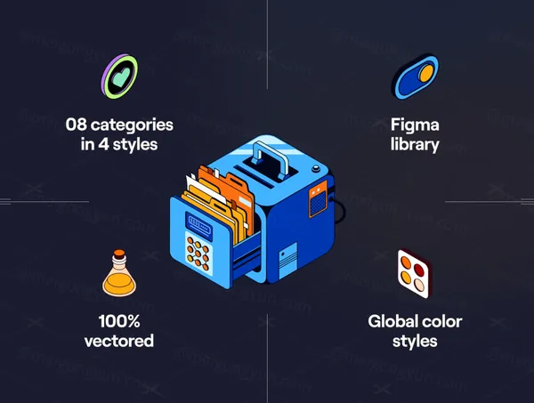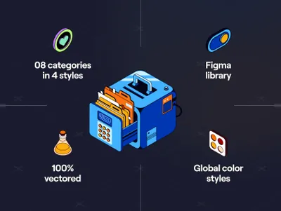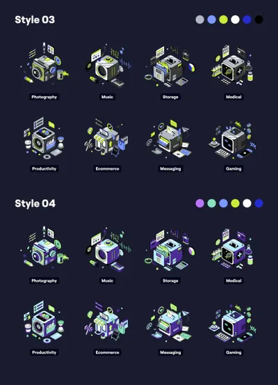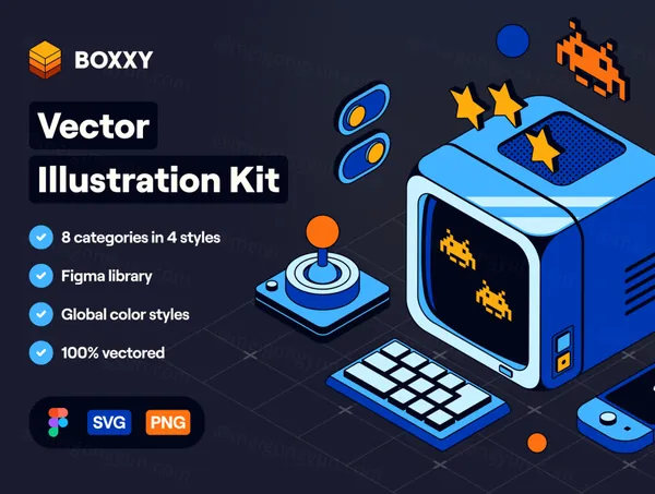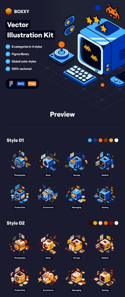 将 BOXXY 视为您设计项目的时间机器。有 8 个类别,涵盖摄影、音乐、存储、医疗、生产力、电子商务、消息传递和游戏,以及 4 种颜色样式,以 Figma、SVG 和 PNG 格式提供,您将拥有将设计提升到下一个阶段所需的所有工具等级。