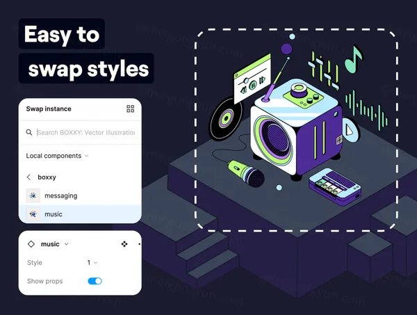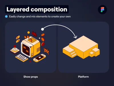 在 Figma 库中,您可以轻松打开/关闭道具、更改颜色和调整任何您想要的东西,拖放以创建您自己的独特场景。
