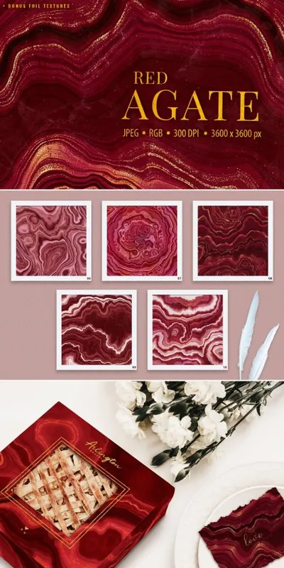 红玛瑙系列具有 10 种充满活力的鼠标纹理,灵感源自玛瑙石、矿物质和宝石。华丽的红色、闪闪发光的金色和清新的白色点缀的华丽色调赋予该系列奢华浪漫的外观。