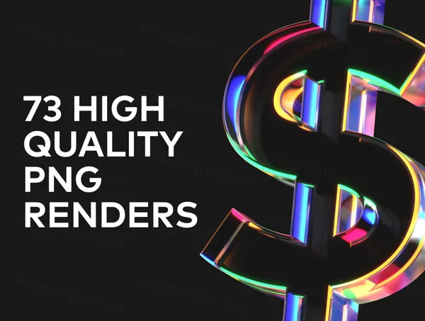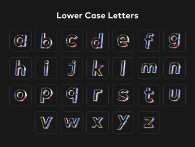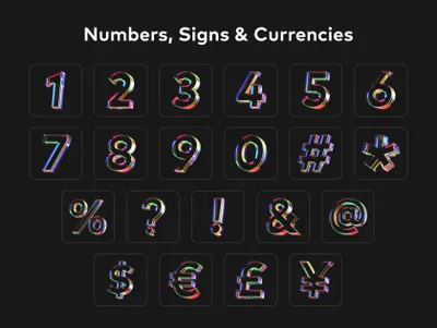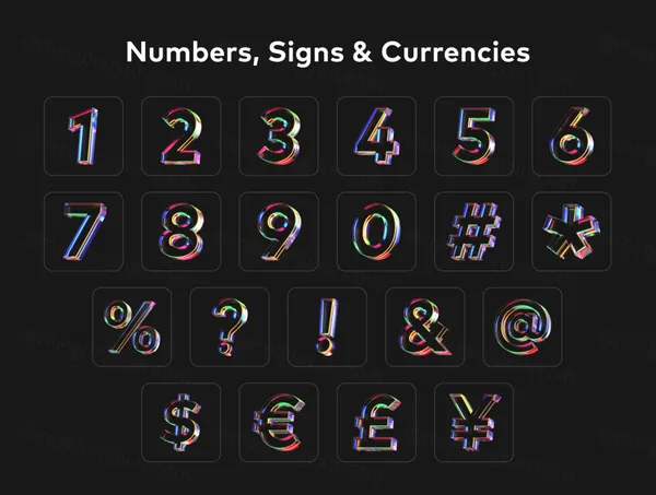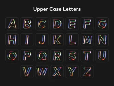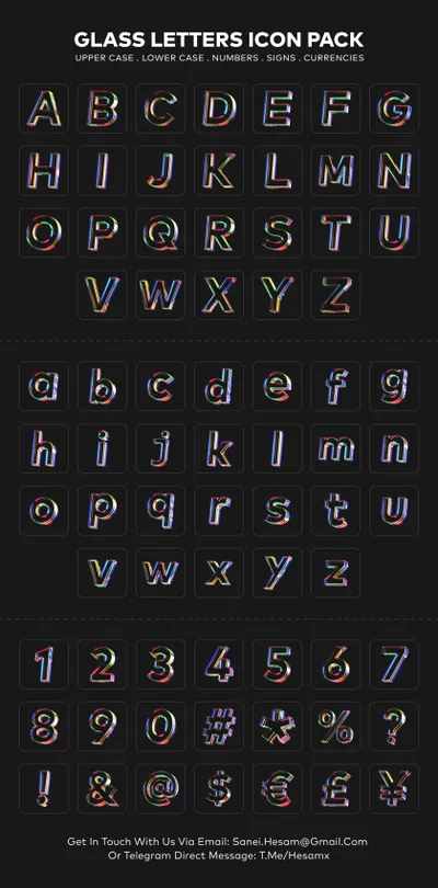 73 个高品质图标的集合,由大写+小写字母、数字、符号和一些彩色玻璃纹理的货币组成。