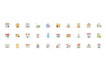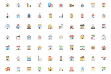 彩色扁平化建筑图标素材 100 Buildings Flat Vector Ic