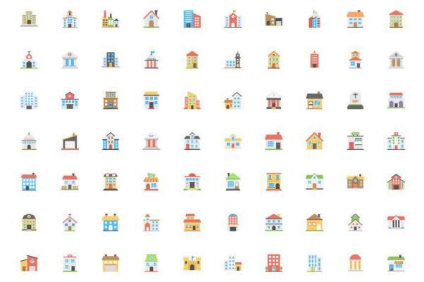 图穷联素材库 » 彩色扁平化建筑图标素材 100 Buildings Flat Vector Ic