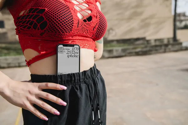 高端户外实拍插在美女模特腰间的手机贴图App设计提案UI展示样机模板 iPhone Pack 01-2