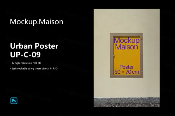 此城市海报样机可作为分层 PSD 文件使用,并且易于定制。您可以通过嵌入式智能对象插入您的设计。