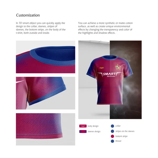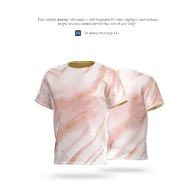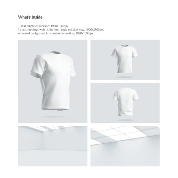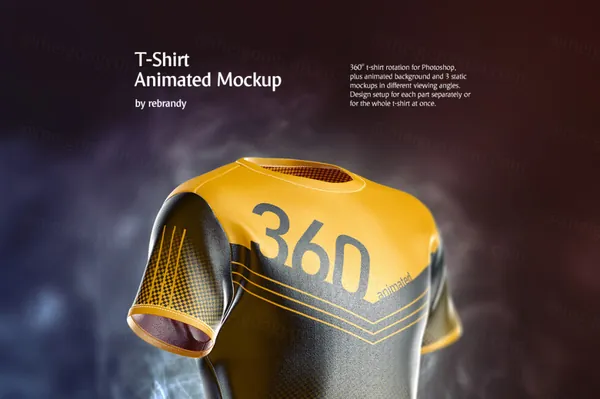 适用于 Photoshop 的 360° T 恤旋转,加上动画背景和 3 个不同视角的静态模型。分别为每个部分或一次为整个 T 恤设计设置。