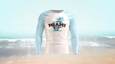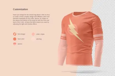 360° 长袖 T 恤旋转加上动画背景和 3 个不同视角的静态模型。一次性插入整件 T 恤的设计,或者为领子、袖子、袖子上的条纹和衣身分别使用不同的颜色和元素创建更复杂的设计。借助集成的 3D 对象和 T 恤的详细图像,您的设计将真实地考虑到织物的所有曲线和不均匀性。