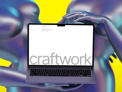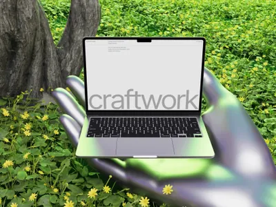 未来感镀铬金属模特笔记本场景网页设计提案样机模板 Liquid MacBook Air M2 Mockups