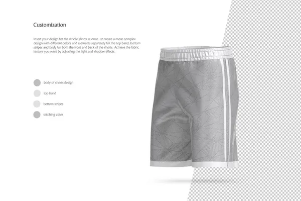 在 360° 旋转运动短裤上展示您的设计。立即插入整条短裤的设计,或分别使用不同的颜色和元素创建更复杂的设计。还可以通过调整光影效果来达到你想要的织物质感。