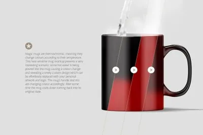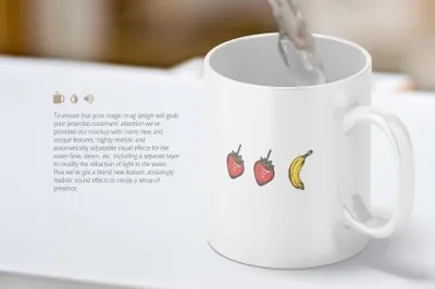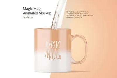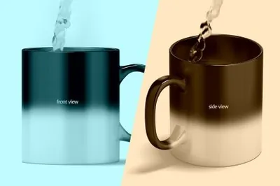 魔术杯是热致变色的,这意味着它们会根据温度改变颜色。这个热敏马克杯模型呈现了一个非常有趣的场景:一些热水被倒入杯子中,导致颜色变化,并显示出可爱的定制设计,可以轻松地用您的个人艺术品和徽标替换。杯子的手柄和边缘也会相应地改变颜色。一段时间后,杯子冷却下来,恢复到原来的状态。