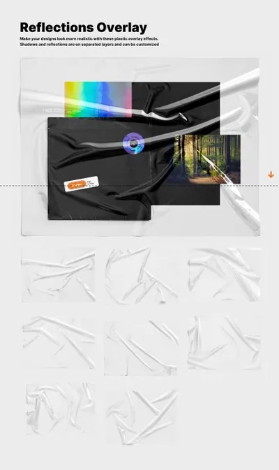 1/ 反射叠加 使用这些塑料叠加效果使您的设计看起来更加真实。阴影和反射位于不同的图层上,并且可以自定义