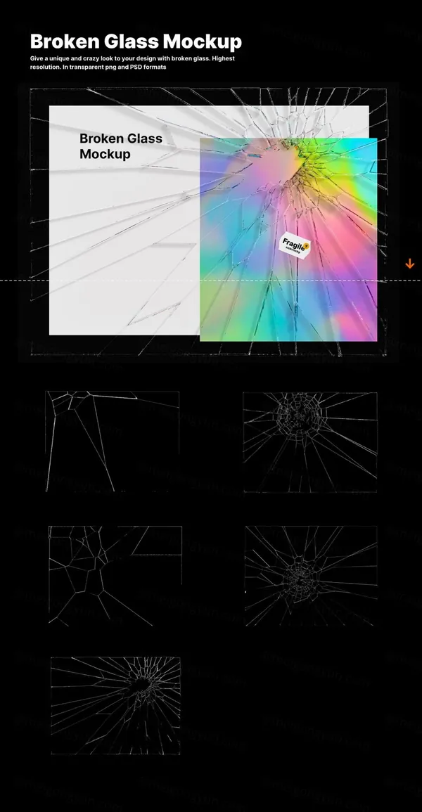 2/碎玻璃样机 用碎玻璃为您的设计带来独特而疯狂的外观。最高分辨率。透明 png 和 PSD 格式