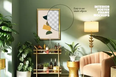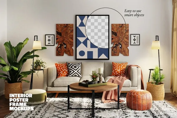 图穷联素材库 » 现代潮流室内家居陈设艺术画框贴图展示样机模板 Poster Mockup Set Modern Interior