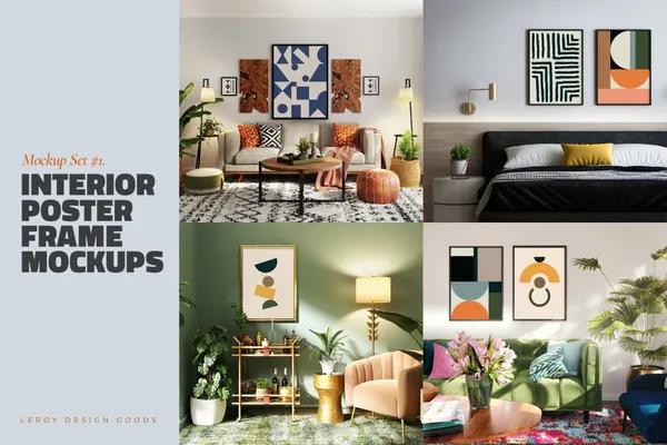 现代室内海报样机场景集,用于代表您的艺术品!4 个时尚场景供您展示您的艺术印刷品或任何设计。