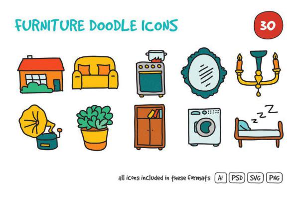 图穷联素材库 » 家具涂鸦图标集 Furniture Doodle Icons Set