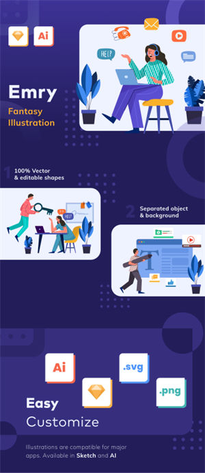 Emry-Fantasy Illustration包含6个插图,这些插图具有独特的场景,这些场景说明了与创业公司世界相关的活动。带有非常灵活的版本,可为您的网站提供非常适合标题和功能的版本。另外,请增强移动应用程序的外观。并可能还会使您的演示文稿幻灯片更加吸引人。
