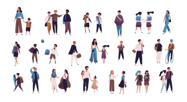 图穷联素材库 » 街头妈妈和学生群彩色扁平卡通插图人物素材 Colorful vecto