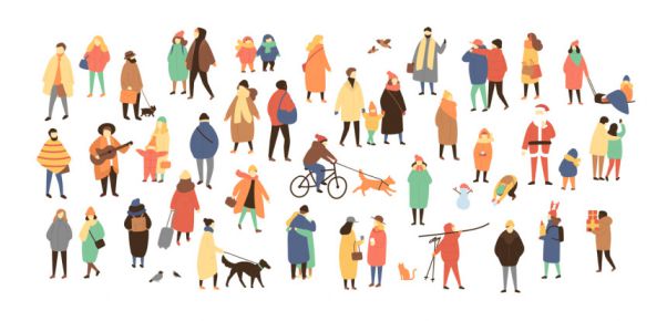图穷联素材库 » 冬日圣诞新年街头户外活动散步表演的男女卡通插画人物素材 Vector