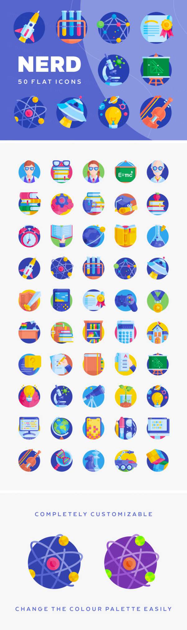 图穷联素材库 » 50个学校数学化学物理科学元素扁平化图标合集包免费下载 Nerd Fl