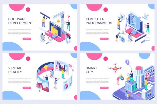 图穷联素材库 » 时尚现代平面设计的等轴等距2.5D区块链landing page
