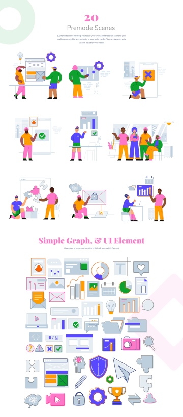 CANDY是2D设计主题插图套件,由Pixelz Studio精心制作。该套件非常适合您的着陆页,入门,网站,移动用户界面,博客,图形模板或任何其他设计作品。释放您的想法,并根据您的需求制作大量场景。