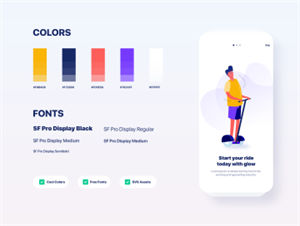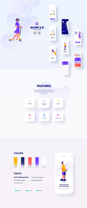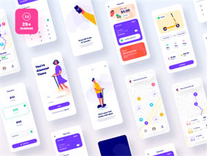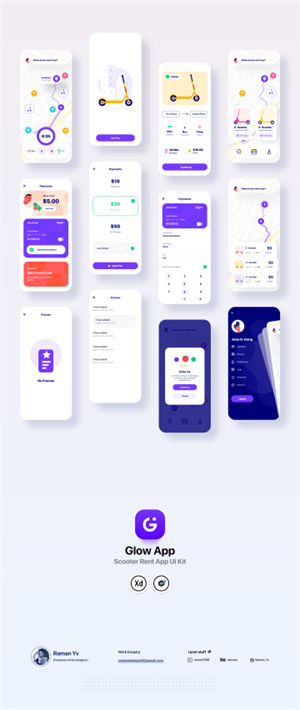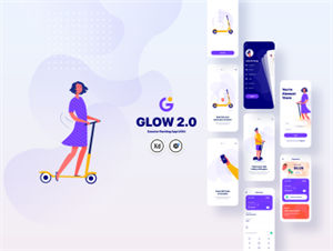 Glow App是一款专业的踏板车租赁应用程序UI套件。干净利落的最小化设计,带有鲜艳的色彩和图形插图,完美结合了易于使用的UI和完美的iPhone X用户体验。它采用Adobe XD(.xd)格式,包括25多种完全可定制的即用型屏幕。