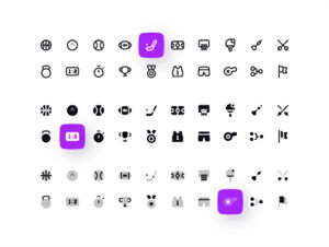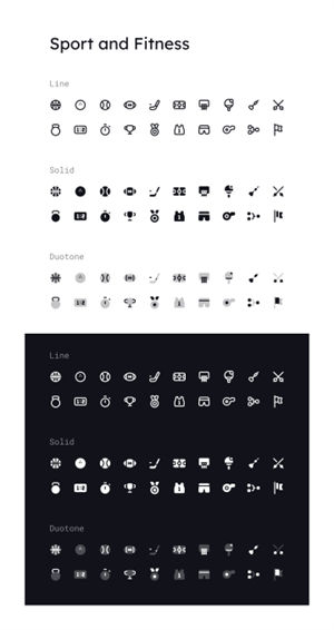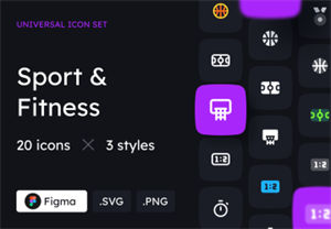 共有20种3种样式的运动和健身图标(线条,实心,双色调), 包括:棒球球,篮球球,篮球筐,保龄球,杯,飞镖,击剑,旗帜,足球,曲棍球,奖牌,记分牌,短裤,足球场,排行榜,秒表,T恤,乒乓球,重量,哨子。