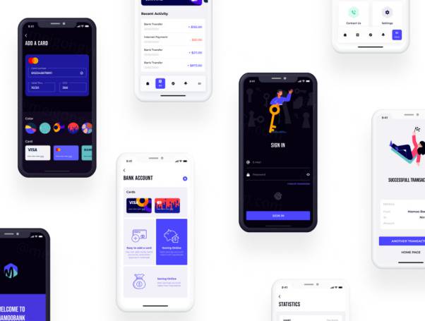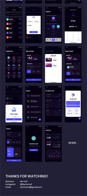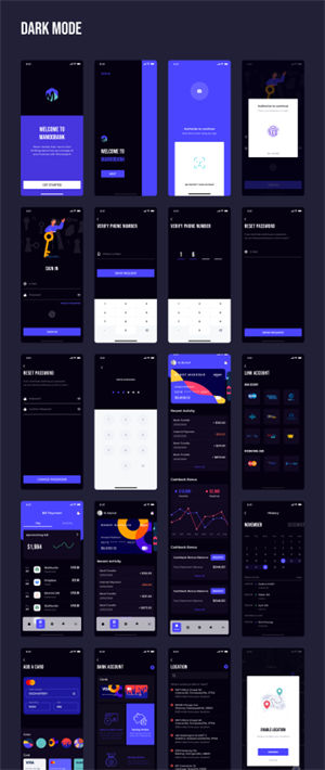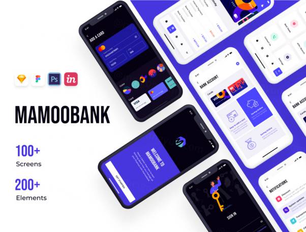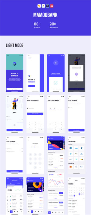 Mamoobank是一个为品牌和设计师设计的电子银行应用程序UI套件。软件包包括Sketch,Figma,Photoshop和Invision文件中的100+屏幕。