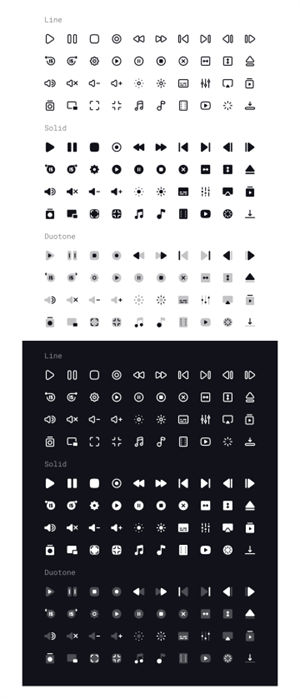 3种样式(线,实线,双色调)中的40个媒体控件图标