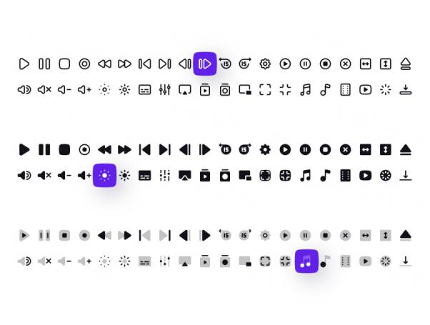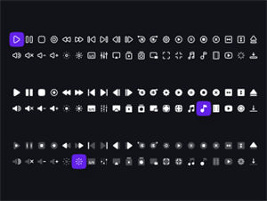 此集合包含:播放,暂停,停止,录制,后退,前进,上一个,下一个,快退,快进,后退15秒,前进15秒,齿轮,播放圈,暂停圈,停止圈,闭合圈,拉伸宽度,拉伸高度,弹出,音量,静音,增大音量,减小音量,降低亮度,提高亮度,字幕,设置,播放,图书馆视频,图书馆专辑,图片图片,全屏,退出全屏,音乐,电影,视频,加载,下载。
