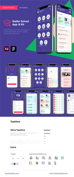 恒星学校管理移动应用程序-学生模块UI套件是管理超级管理员,教师,学生,财务人员和公交人员的解决方案的一部分。这些不同的移动应用程序将为其利益相关者带来丰富的用户体验。该UI套件包含即用型组件,版式,设计系统和可自定义的调色板。拥有25种以上的独特布局,我们涵盖了学生应用几乎所有需要的方面。此UI工具包可用于Adobe XD和Figma。