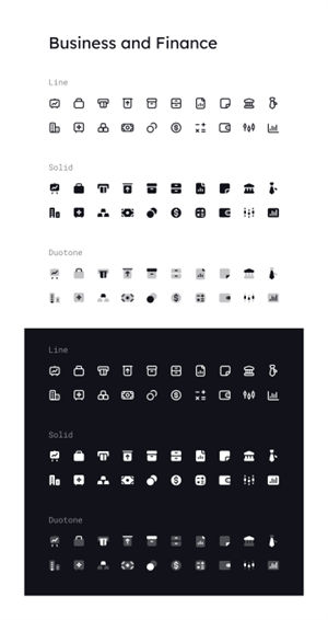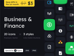 3种样式(线形,实心,双色调)中的20个商业和金融图标