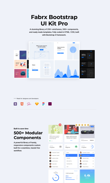 一个惊人的库,包含250多个线框,500多个组件以及现成的模板。使用Bootstrap 4框架构建的HTML / CSS完整编码。