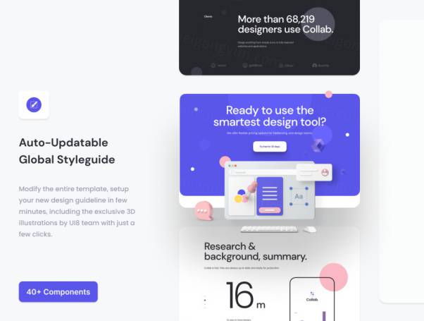 认识Collab,这是功能全面的着陆页工具包,其中包括代码,设计文件以及可在Figma中编辑的精美3D插图。