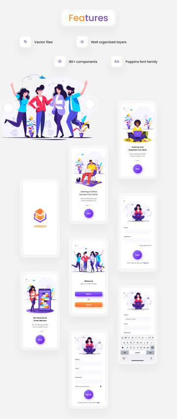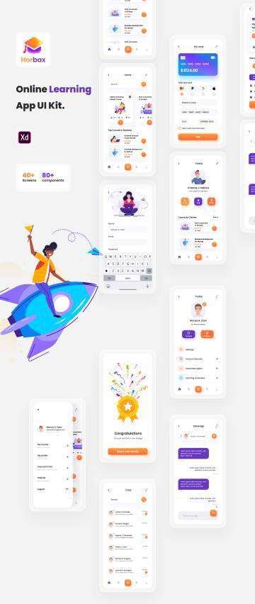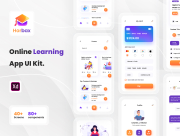 Horbax是一款在线学习应用程序UI套件,具有简洁时尚的风格,其中包含40多个高质量屏幕和80多个适用于iOS且使用iPhone X屏幕尺寸(375px X 812px)的组件。