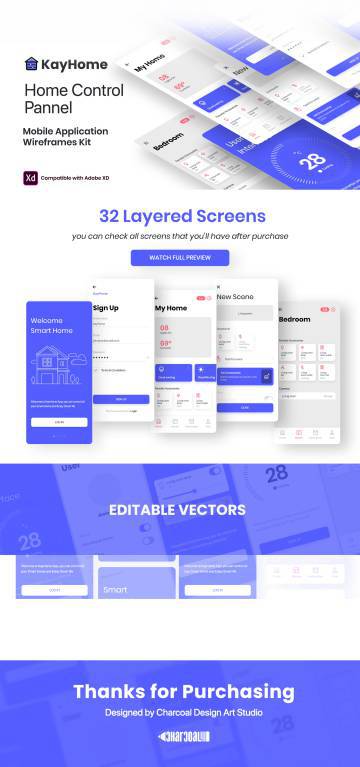 KayHome移动应用程序-UI线框套件的设计遵循现代设计趋势。小型或大型规模,适用于为家用电子设备和电子设备提供控制面板服务的所有企业或创业公司。修改模板非常简单。我们每天都在增加新的东西,以使我们的设计更美观,更坚固。您可以自由使用我们的所有更新。