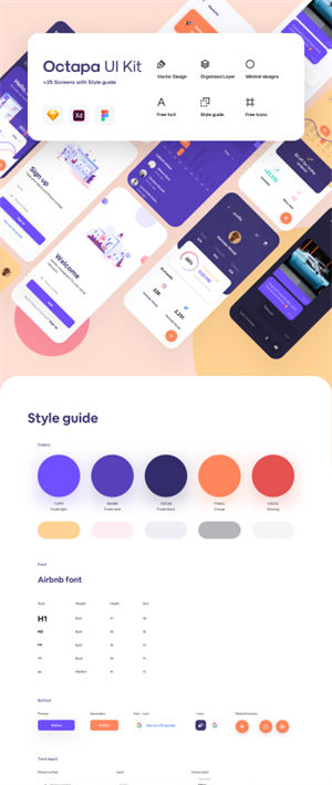 该UI套件包含25个UI屏幕,还包含样式指南和组件以及带有Airbnb字体的免费图标。