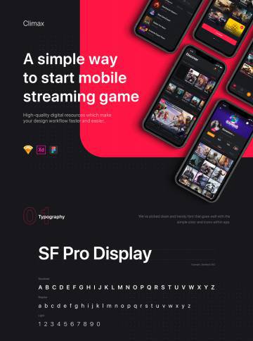 Climax-Live Game Streaming UI Kit包含31个精美的应用程序UI设计屏幕模板,可帮助初创公司,设计机构和UI / UX设计师更轻松地创建专业的Streaming游戏应用程序。该套件与iOS和Android系统100%兼容。该文件包含所有最新功能,例如符号,覆盖,调整大小选项,文本和图层样式。