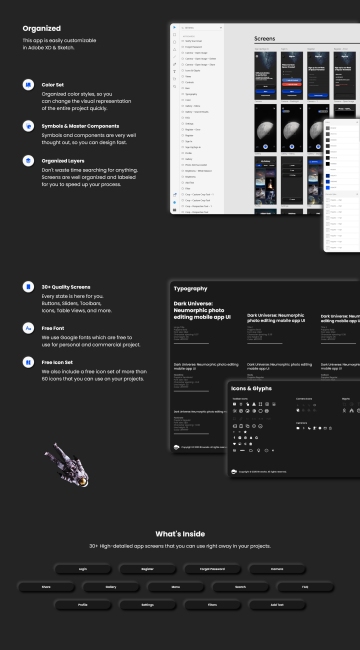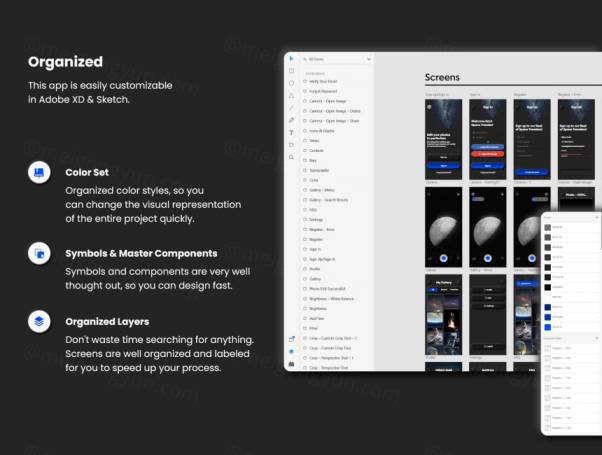我们创建了31多个屏幕供您使用,但还有更多。该应用程序是完全可定制的,这意味着我们为每个流行的设计软件Adobe XD,Figma和Sketch都非常仔细地创建了组件/符号。因此,现在您可以轻松拖放并创建更多屏幕,甚至创建完全不同的应用程序。