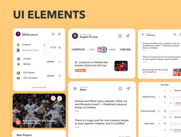 图穷联素材库 » 运动体育赛事直播移动APP界面UI素材 Kick off UI Kit