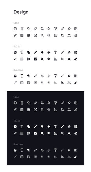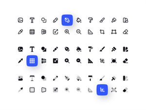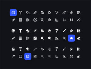 此集合包含:图像,文本,圆圈和正方形,铅笔,钢笔,油漆桶,油漆滚筒,切片工具,画笔,调色板,选取器,网格,透视图,比例尺,放大,缩小,三角尺,裁切工具,矢量编辑,橡皮擦。
