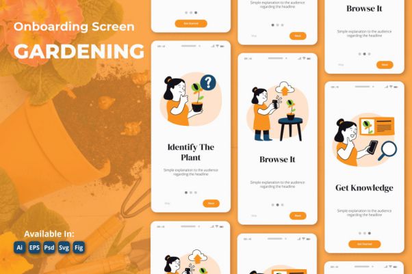 园艺和植物应用程序启动页插画模板(AI,EPS,FIG,PSD,SVG