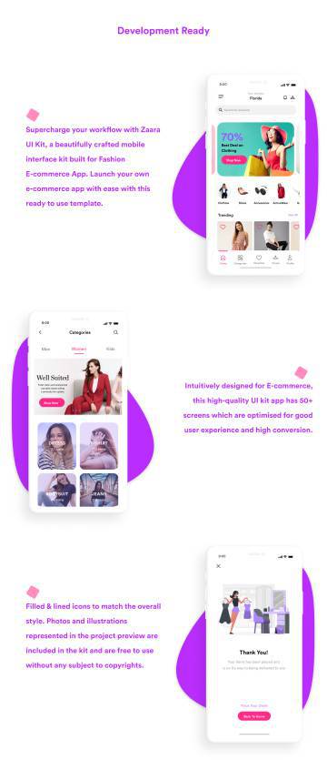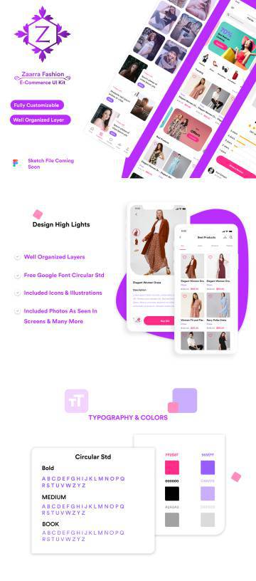 Zaara是一个干净而详细的时尚电子商务移动应用UI套件,它是使用面向转换的UX设计和构建的。