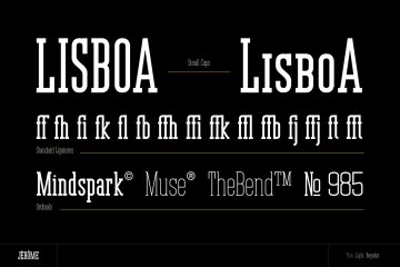 Jerome的灵感来自紧凑,坚固而坚实的字体。它带有3个砝码:薄,轻和常规。杰罗姆(Jerome)具有结实而坚实的线条,华丽的字形和令人惊叹的风格。它非常适合徽标,杂志,报价,海报,品牌,名片,文具,设计标题,博客标题,艺术报价,版式。