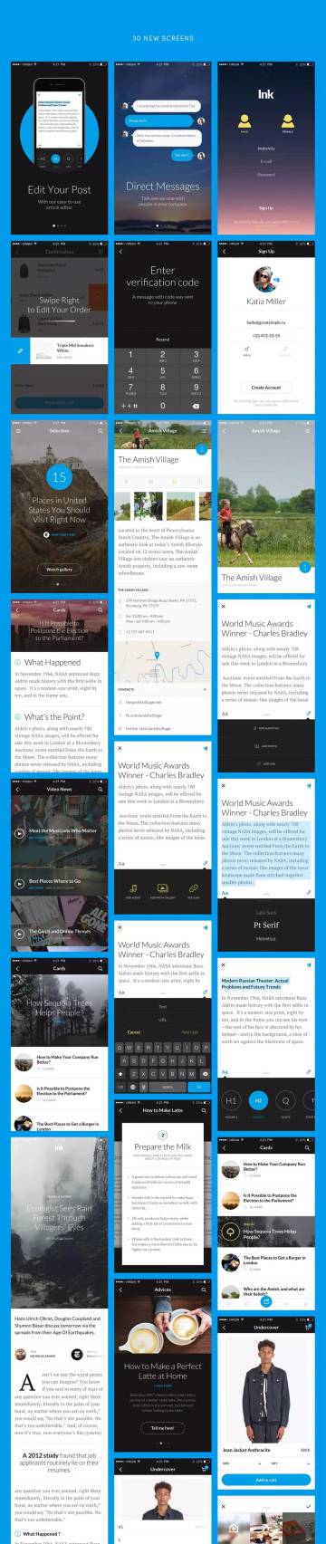 一套专业的iOS Ui kits打包下载,包含PSD和Sketch两种格式,这套kits和之前的一样,包含了常用的电商、资讯、社交和数据统计等,这套的特别是资讯类的页面非常丰富,肯定值得你拥有