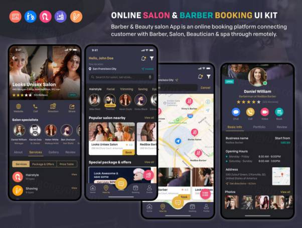 理发/沙龙/美容App应用iOS UI套件是一个在线预订平台,可通过电话,实地拜访,消息传递,音频和视频通话将客户与理发,沙龙,美容师和水疗中心联系起来。成功地弥合了客户与企业所有者之间的鸿沟。帮助您节省时间并增加资金。了解了客户的困难后,该美容APP应用程序集成了许多有用的功能,例如提前预订以及理发师的详细信息,增值服务,介绍等。用户可以轻松地在该地区寻找沙龙并找到通过集成的地图定位。